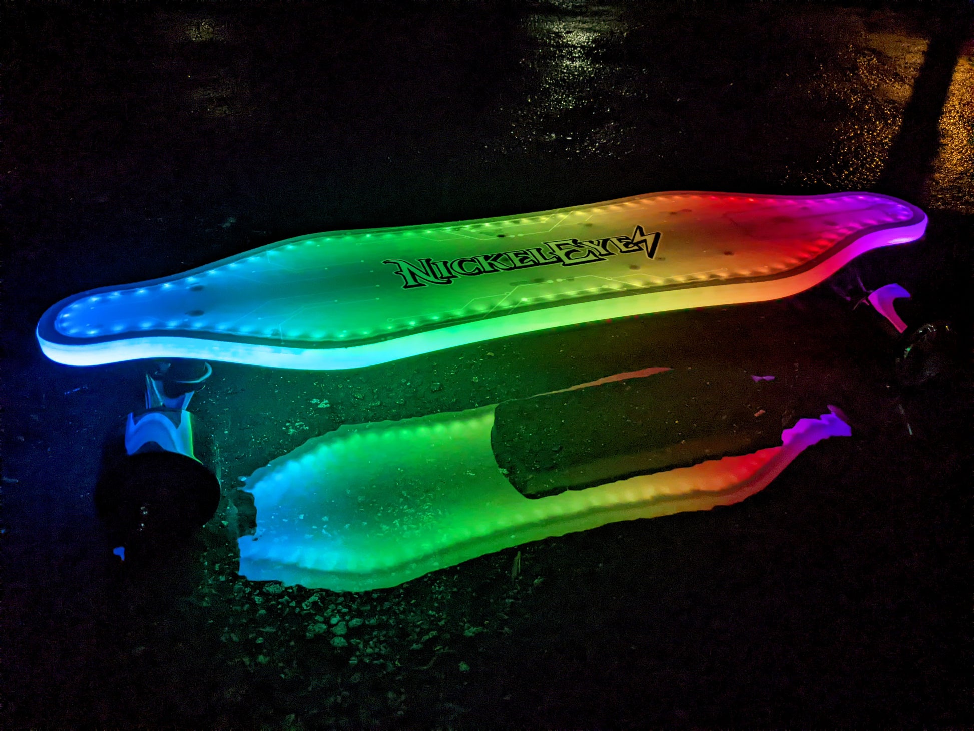 Light up the night with our newest Electric Skateboard from NickelEyes. With the simple click of a button you can activate the color changing LEDs! Super fun and perfect for getting around easily with it's compact design.