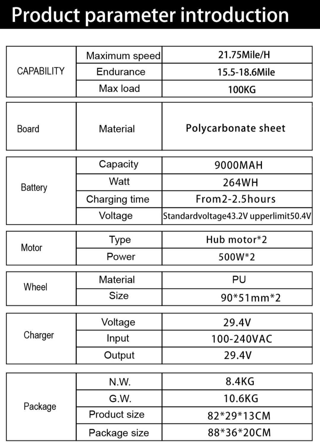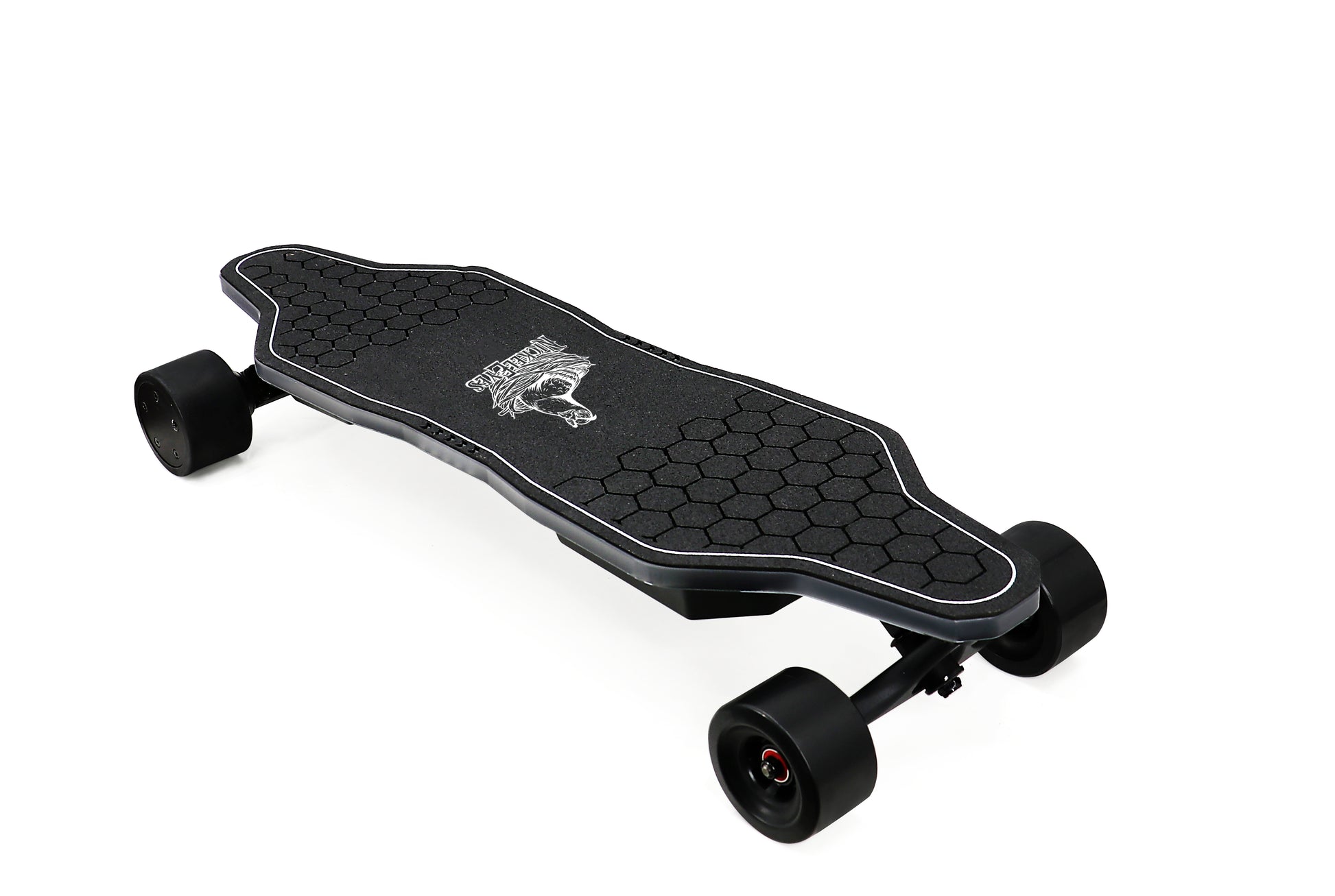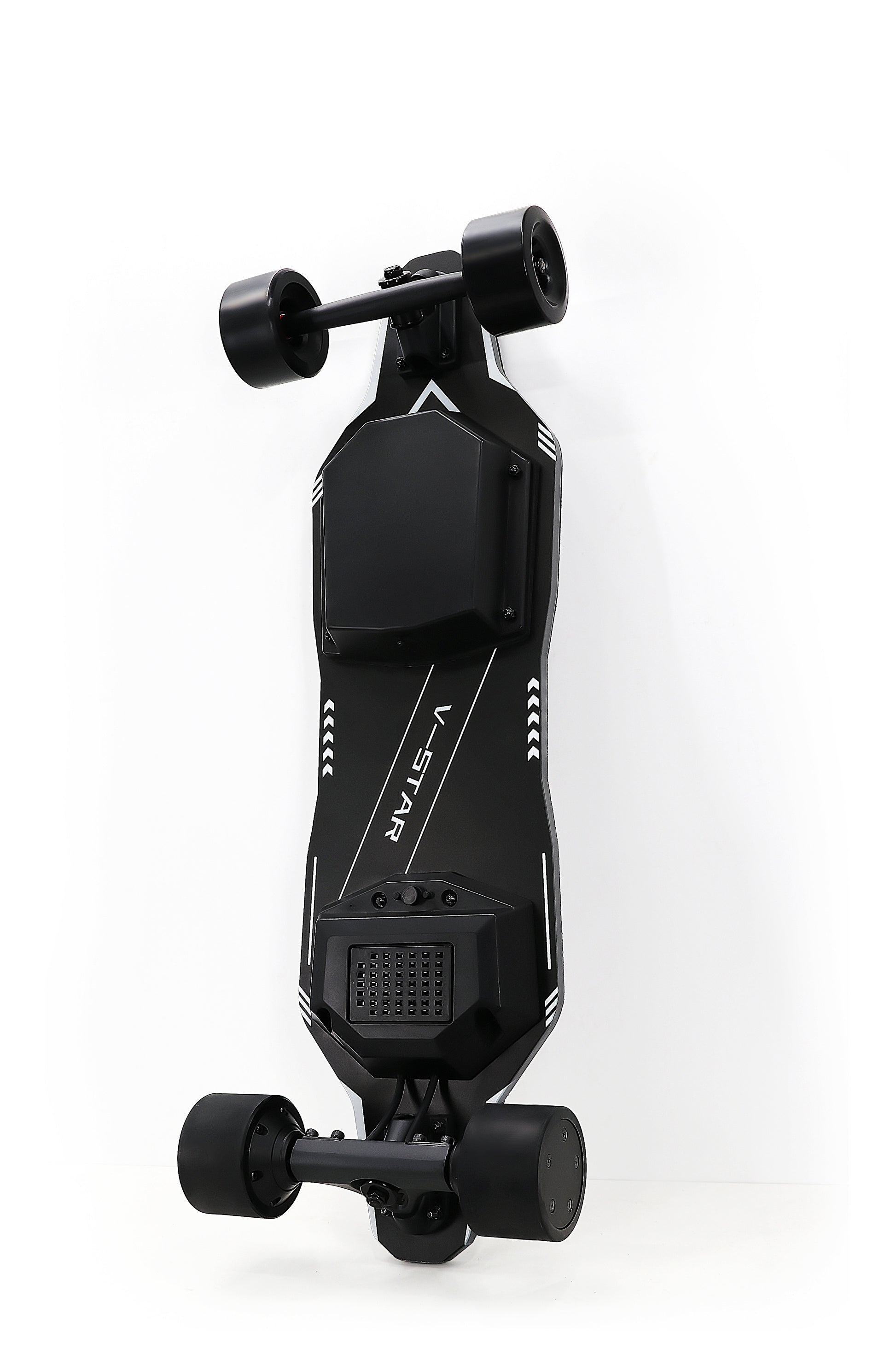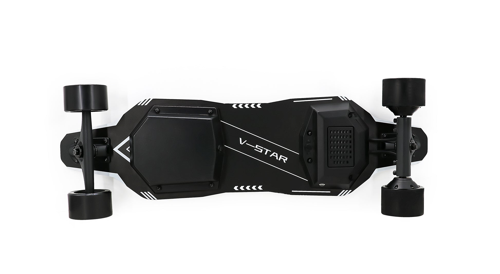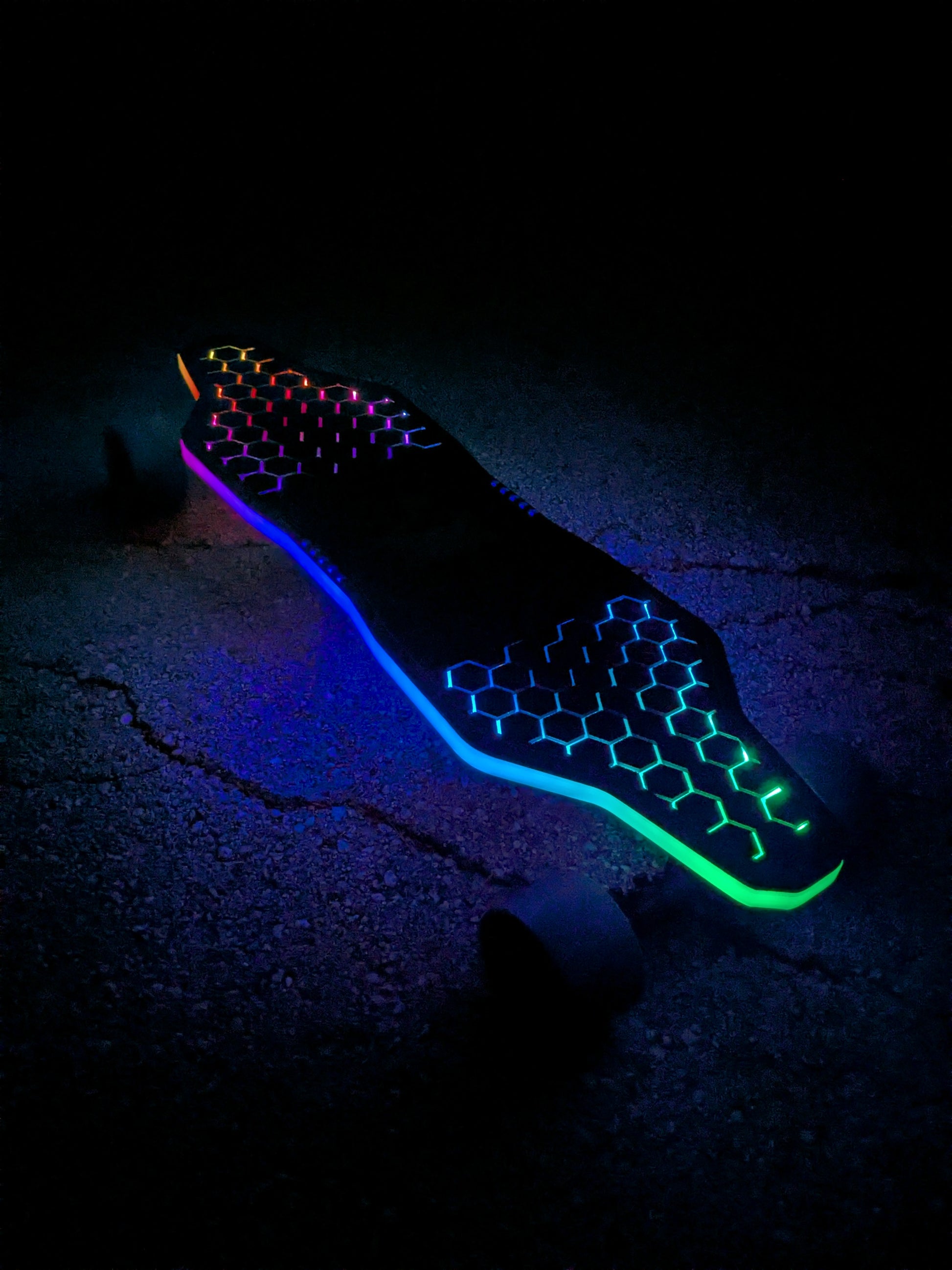 Experience the ultimate night ride with the Volt-Star LED electric skateboard. With honeycomb foam grip tape and a translucent deck, you'll ride in comfort and style. Powered by Dual 500w Hub Motors and a 9Ah 7s2p 21700 Lipo battery pack, you'll hit a top speed of 21 mph and enjoy a 15 mile range.